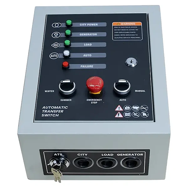 Выполненный в металлическом корпусе с классом пыле- и влагозащиты IP41, блок автоматического ввода резерва (АВР) Dinking 1/3-фазный может размещаться внутри или вне помещений. Для подключения к 8-контактному ATS-коннектору бензогенератора в комплект поставки включен 8-метровый сигнальный кабель. В качестве силовых коммутационных элементов в данном устройстве используются контакторы электромагнитного типа, которые обладают более высоким быстродействием, по сравнению с переключателями на основе мотор-привода. Режим работы системы АВР "ручной" либо "автоматический" и "летний" или "зимний" вариант запуска генератора устанавливается двухпозиционными поворотными переключателями на передней панели, где также размещены индикаторы, позволяющие визуально контролировать состояние системы электроснабжения.