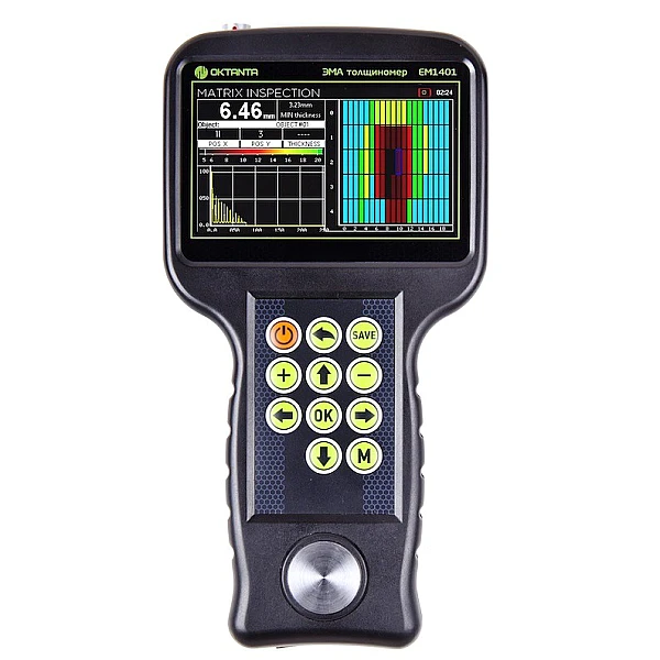 Толщиномер EM1401 UT имеет цветной дисплей, защищённый ударопрочным стеклом. Как и все ЭМА толщиномеры выпускаемые нашей компанией, толщиномер EM1401 UT использует специальный алгоритм обработки данных, который позволяет корректно измерять толщину в автоматическом режиме при наличии мешающих факторов, таких как анизотропия металла, наличие нескольких отражателей, наличие внешних помех. Помимо автоматического режима измерения толщины прибор позволяет использовать ручные режимы измерения по первому эхо-сигналу и по разности между любыми двумя эхо-сигналами. Ручной режим рекомендуется использовать на сильно корродированных объектах.