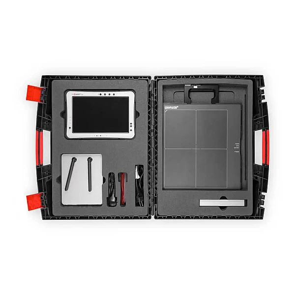 Плоскопанельный детектор устанавливается на объект контроля с помощью магнитной или ременной оснастки. После чего, источник ионизирующего излучения располагается на необходимом фокусном расстоянии от детектора.