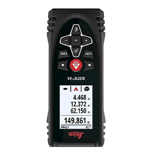 Прибор позволяет выполнять измерения на расстоянии от 50 мм до 150 м. Погрешность при определении расстояний не превышает 1 мм. Кроме того, дальномер Leica Disto X4 оснащен датчиком наклона. Благодаря ему можно выровнять дальномер и исключить погрешность при определении расстояния, а также вычислить высоту объекта на основе длин двух сторон треугольника и углу между ними.