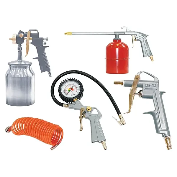 В комплект набора входят: краскораспылитель с нижним бачком объемом 1,0 л, пневмопистолет для вязких жидкостей с бачком 0,85 л, пневмопистолет для продувки, пневмопистолет для накачки шин с манометром, спиральный шланг длиной 5 м.