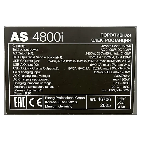 Fubag AS 4800i оборудована множеством выходов, включая USB, USB-C, USB-A, DC и AC, а также разъемы для солнечной панели и автомобильного прикуривателя. Это позволяет одновременно подключать и заряжать разнообразные устройства.