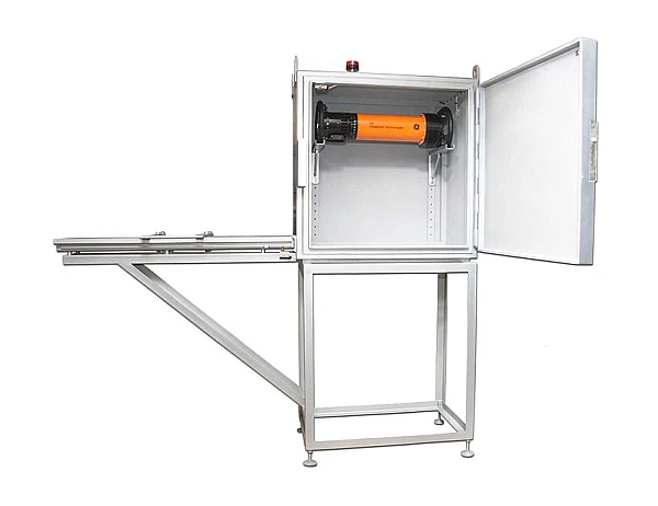 Для ввода длинномерных изделий с левой стороны камеры имеется окно, оборудованное защитным тоннелем-лабиринтом с откидной верхней крышкой. Крышка имеет магнитный фиксатор открытого положения. Дверь и крышка тоннеля для ввода длинномерных деталей оборудованы конечными выключателями, блокирующими включение и работу рентгеновского аппарата при открытии.