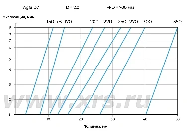 Ниже приведены номограммы экспозиций для направленных и панорамных рентгеновских аппаратов RayCraft XS при просвечивании стали.