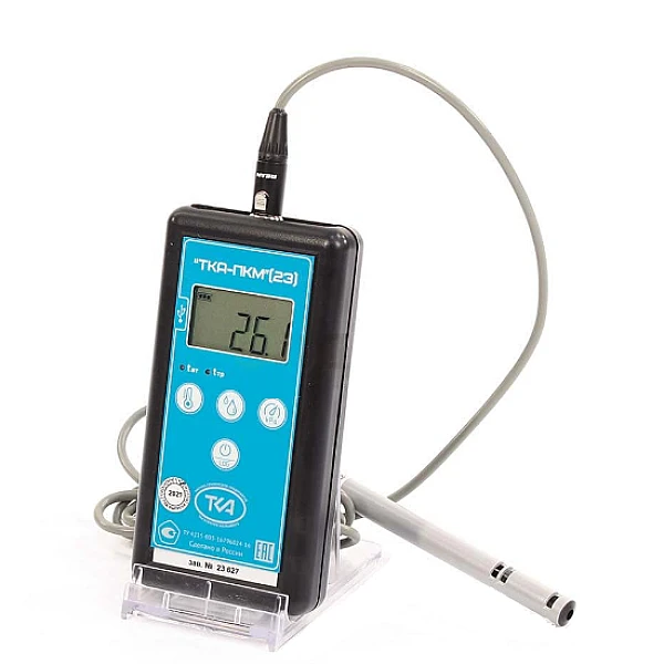 Термогигрометр ТКА-ПКМ 23 предназначен для измерения относительной влажности и температуры воздуха, а также отображения вычисляемых в режиме реального времени параметров: температуры влажного термометра (tвл, °С) и температуры точки росы (tтр, °С), с выходом на ПК.